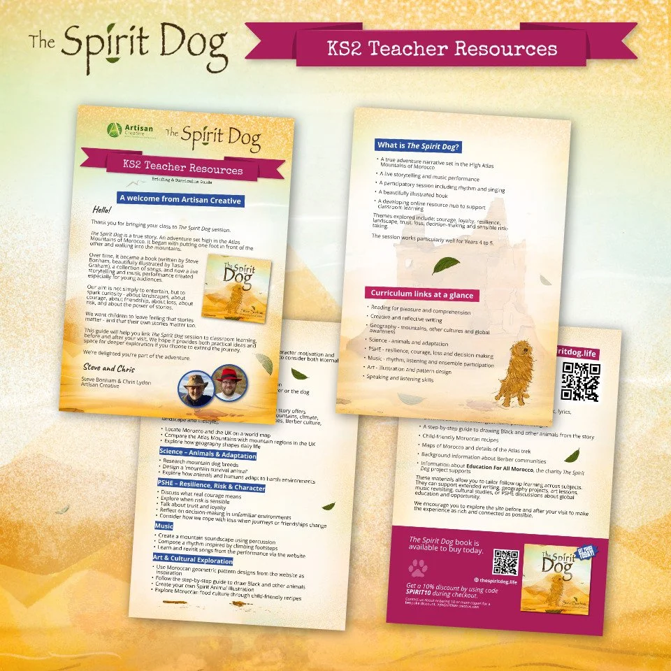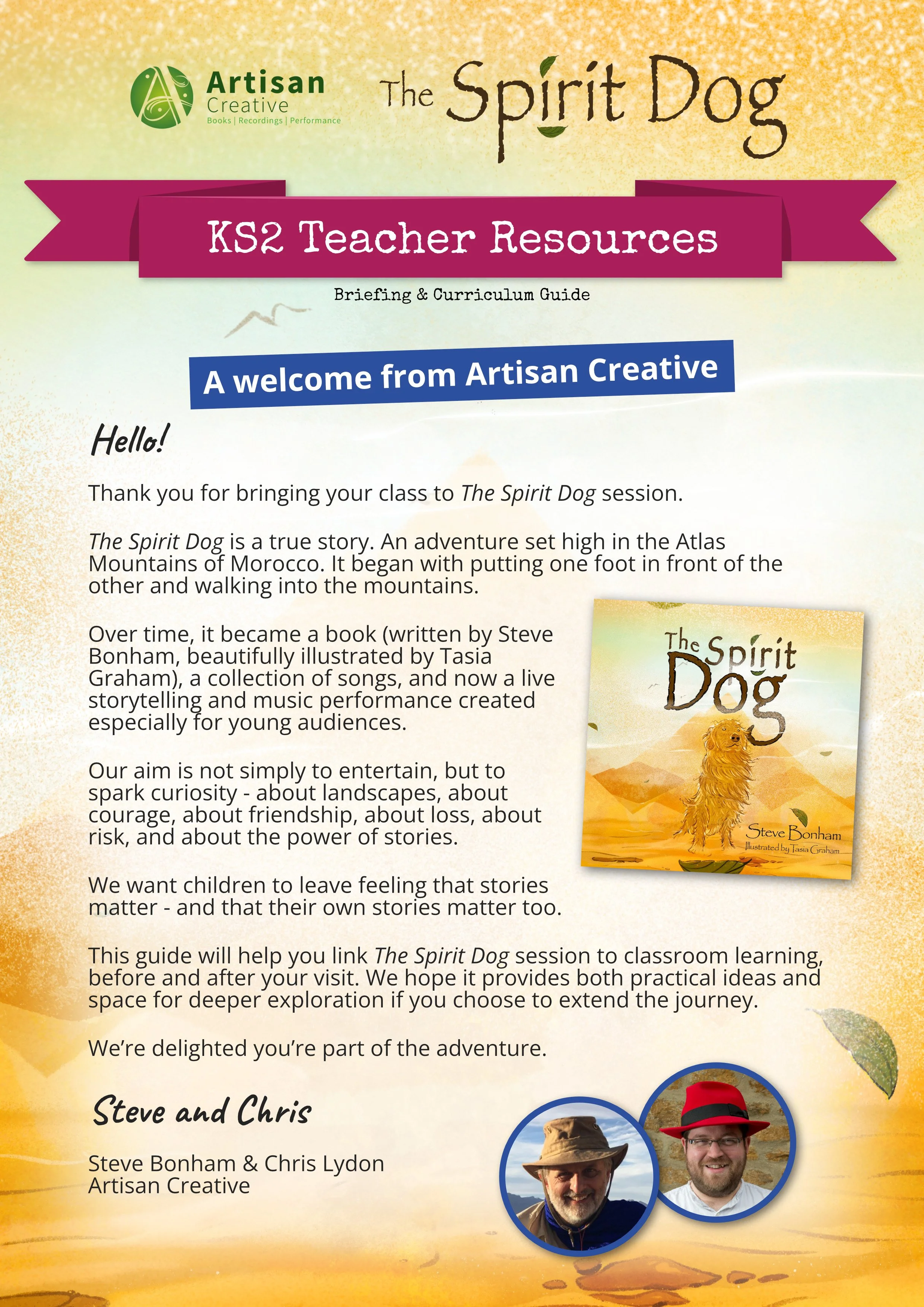 If you’re bringing your class to The Spirit Dog, this Teacher Resource Pack is designed to help you make the most of the experience. It offers clear curriculum links for KS2, practical classroom activities, and ideas for meaningful follow-up across English, Geography, PSHE, Music and Art. You’ll also find ways to connect your pupils with our online songs, maps, drawing guides, Moroccan design resources and information about the Education For All Morocco charity the project supports - helping the story live on long after the session ends.